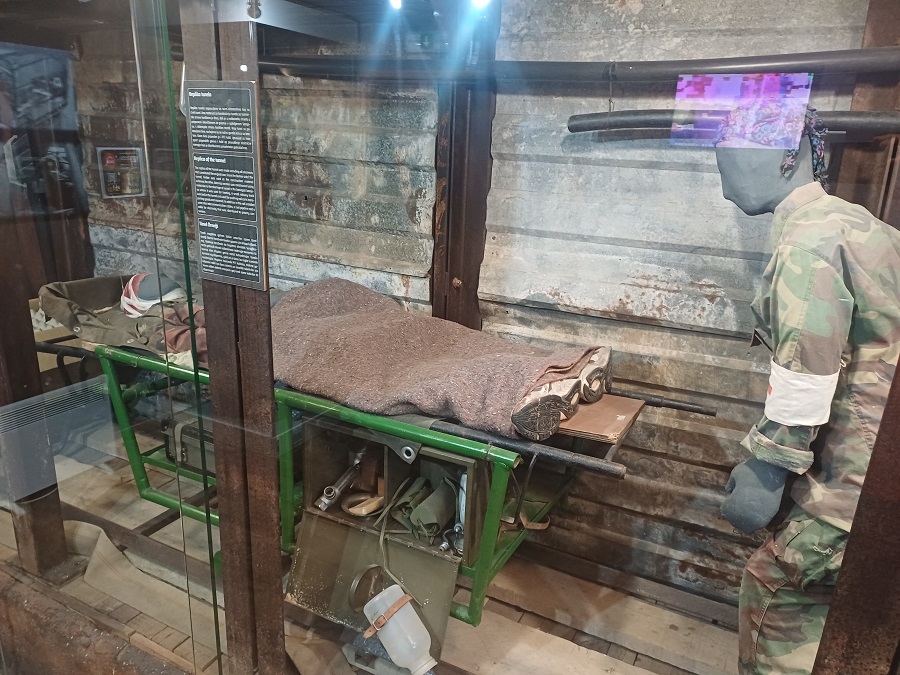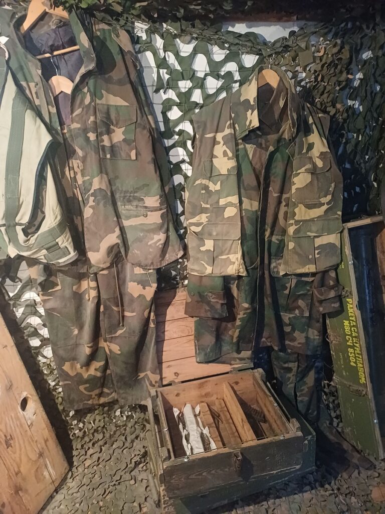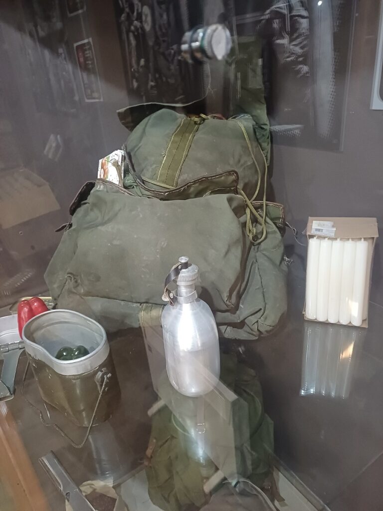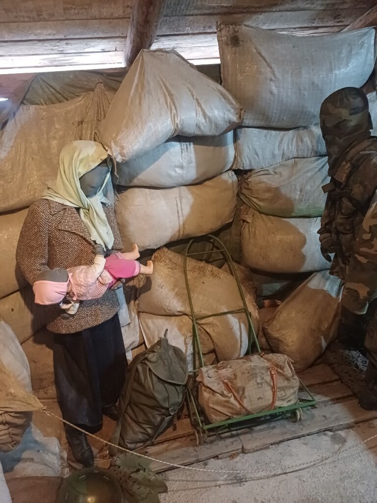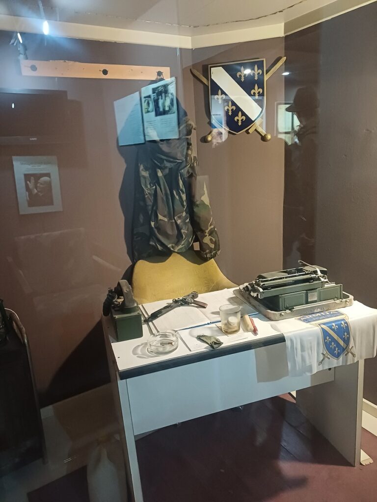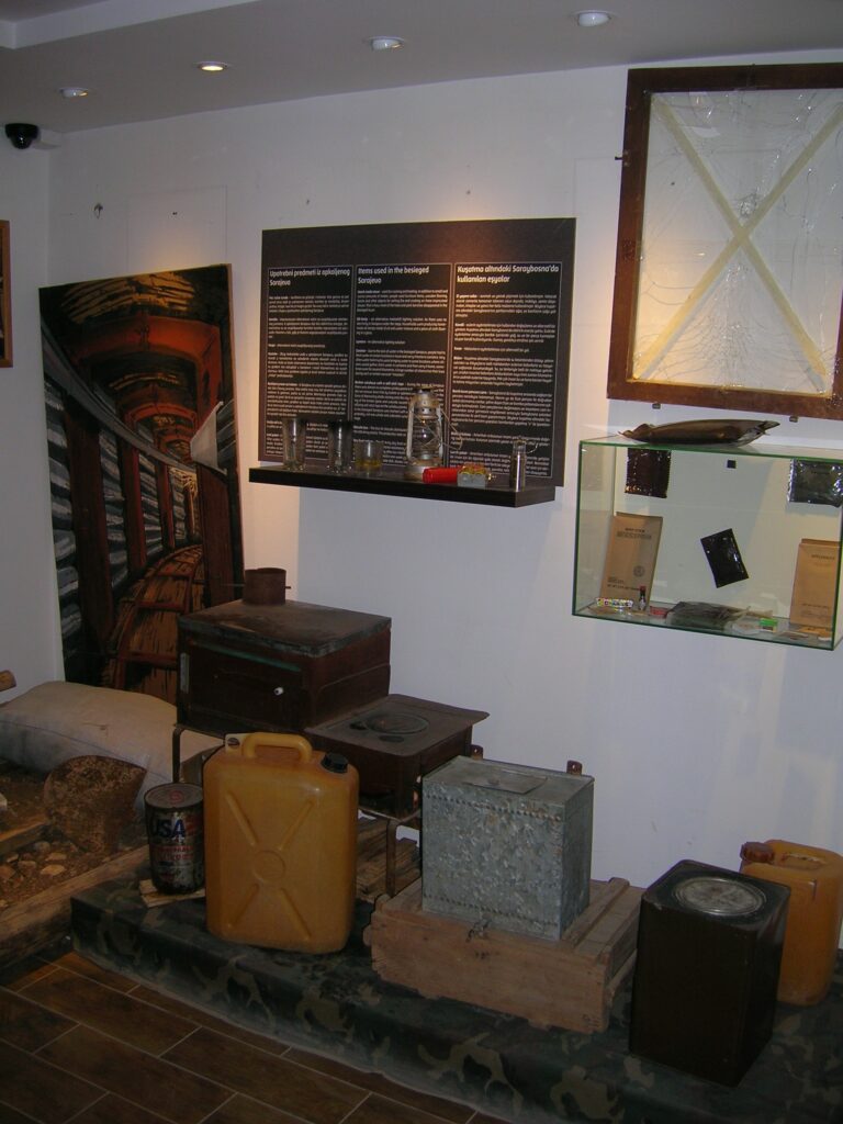 Mogu se videti paketi humanitarne pomoći koje su međunarodne organizacije slale građanima Sarajeva, dok su u podrumskoj prostoriji izložene uniforme, oružje, kao i odeća i obuća koju su branioci grada nosili u nedostatku originalne vojničke ili policijske.