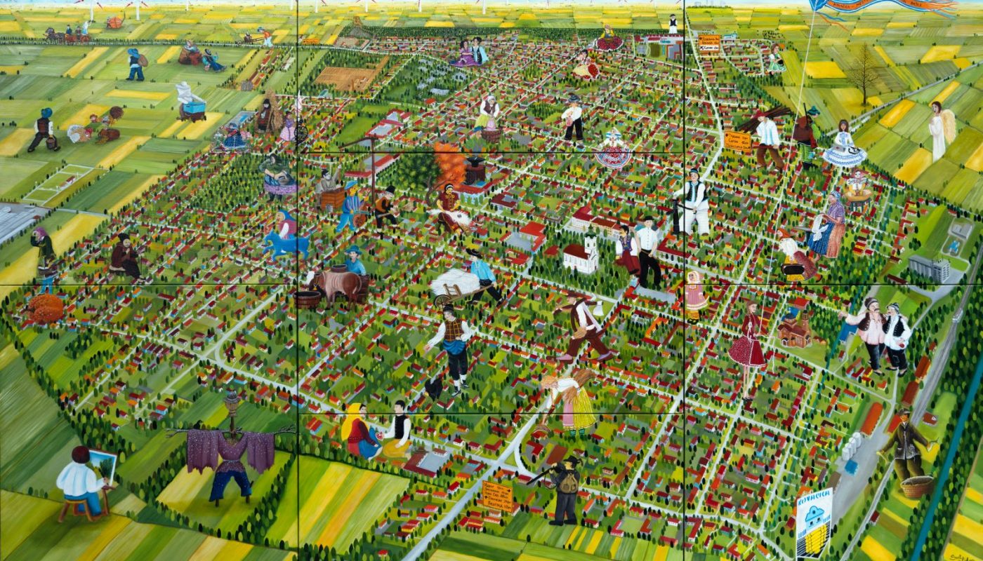 Ti karakteri, likovi, jesu u formi džinova i predstavljaju svakog slikara zasebno, u različitim seoskim poslovima, a u prenesenom značenju, autorka slike Ivana Svetlik želela je da istakne da su upravo slikari i njihova dela dovela Kovačicu na svetsku mapu umetnosti.
