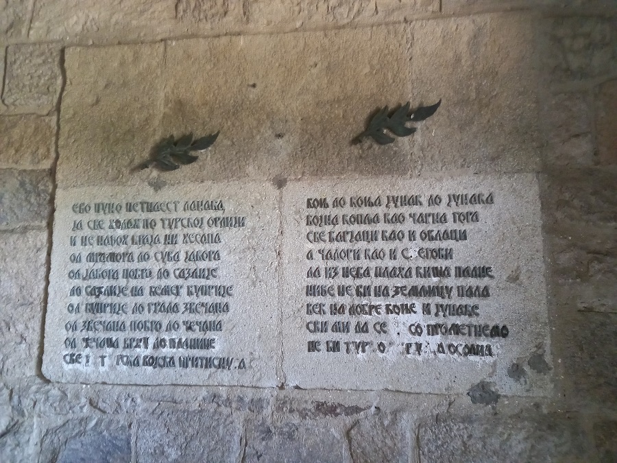 Na zidovima su postavljene metalne ploče sa stihovima iz kosovskog ciklusa.