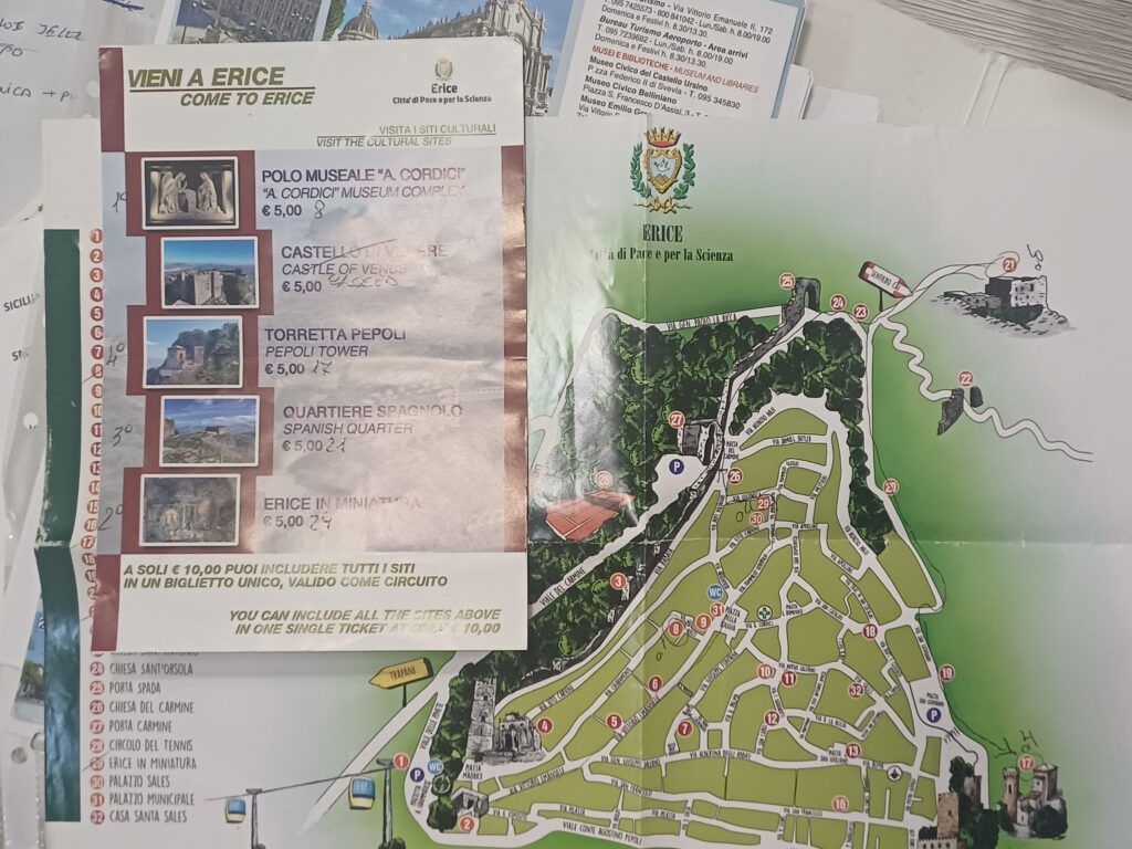 Odmah na samom ulazu u stari grad, kod kule Trapani, a iznad prostranog parkinga na kome smo ostavili auto, nalazi se kućica turističko-informativnog centra, gde smo kupili tzv. Erice Card – integrisanu ulaznicu za nekoliko lokaliteta.