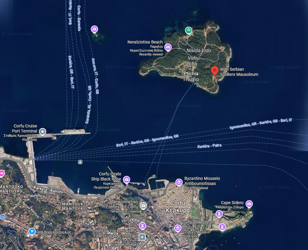 Sastavni deo svake turističke posete Krfu (barem za ljude iz naših krajeva) je i obilazak malenog ostrva Vido, mesta od velikog značaja za istoriju srpskog naroda.